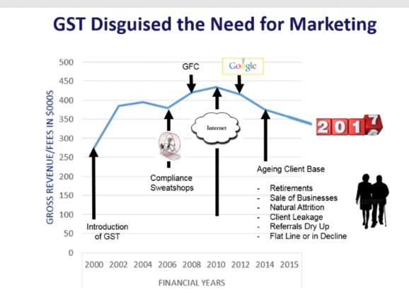On the back of the GST compliance boom, a lot of firms experienced a decade of growth. However, they got very busy and in some cases, complacent. They took their foot off the marketing pedal and at the same time, their ageing clients starting to retire, sell their businesses and die. Put simply, the GST disguised the need for marketing and this coincided with the internet explosion.